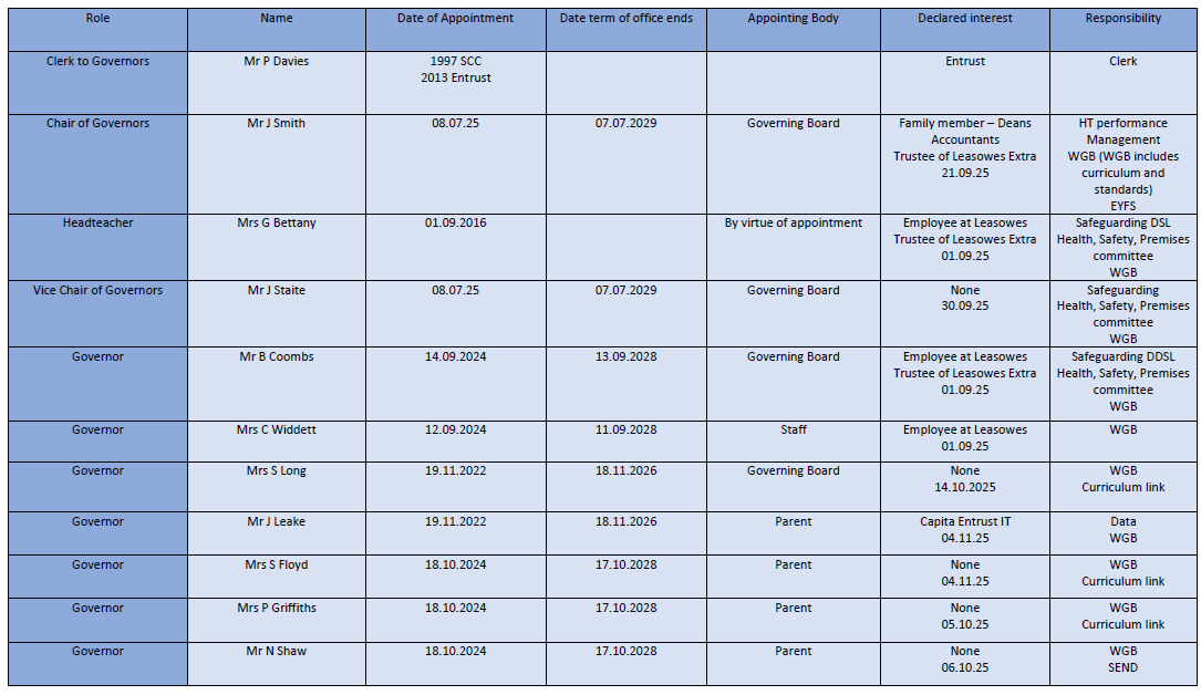 As Governors, we work closely with the school by providing support, challenge and helping to set the strategic direction of the school. We also monitor and evaluate the work of the school and help set priorities for improvement. We want the children of Leasowes to be as successful as possible whilst enjoying a broad education.