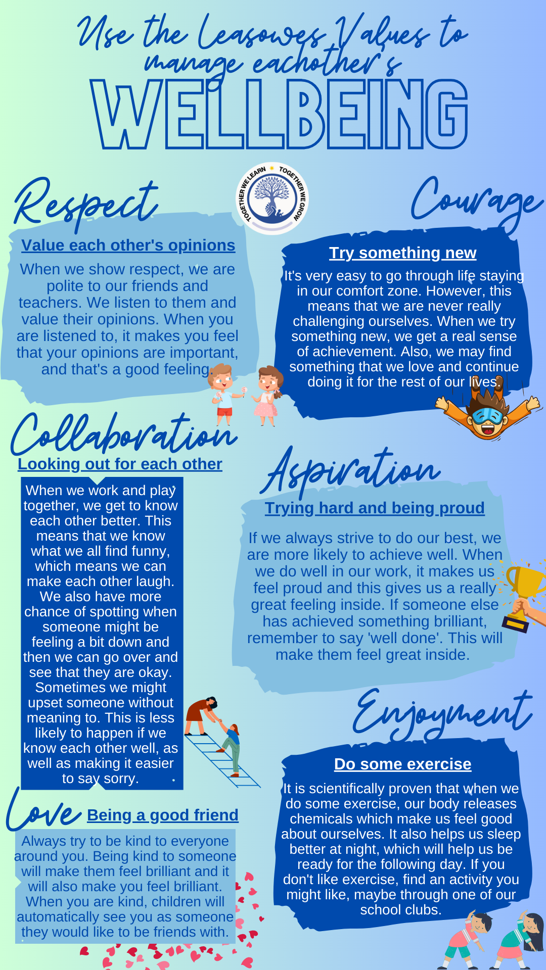 As you know, Mrs Bettany will always tell you that 'Safety' is the most important part of her job to get right. Everyone in school knows that if you all feel safe, then you are happy and ready to learn. In school, every single member of staff is trained in how to keep you safe, and we have 'policies' in place to make sure of this. Sometimes these policies are difficult to read, so we have made one for you that is much clearer to follow. This has been written and agreed alongside the Junior Leadership Team. Your teacher has already gone through it with you, and it is displayed in the class. You will also find it broken down on our Safeguarding display next to the KS2 hall. Remember everybody: Together we learn, Together we grow, Together we stay safe!