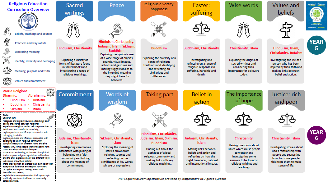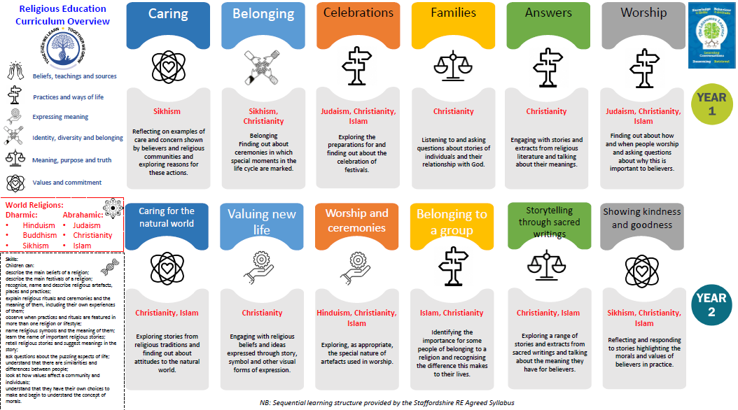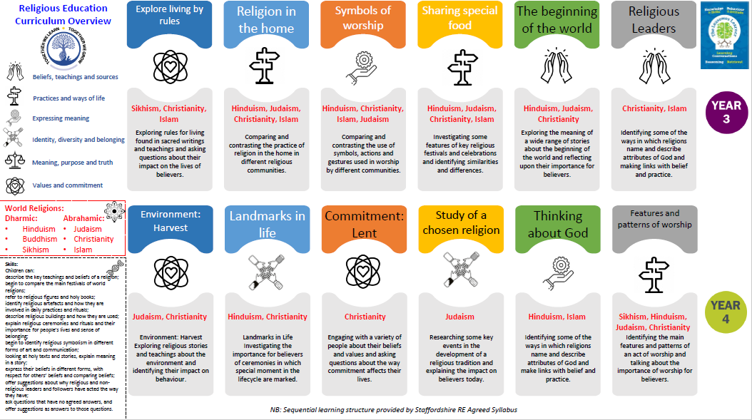 At Leasowes, our RE curriculum follows the Staffordshire Agreed Syllabus for RE, which works under the guidance and advice of SACRE (Standing Advisory Council on Religious Education). Children at each Key Stage take part in a detailed study of the beliefs and practices of Christianity (we follow traditions of a broad Christian character at Leasowes) as well as learning about other world religions. Each year group covers 6 units across the year, which are mapped out on the RE curriculum overview. Units are planned thematically and include concepts such as: caring, belonging, celebrations and commitment. Links to examples from different religions are thoughtfully planned within units that the children learn about aspects of different faiths progressively.