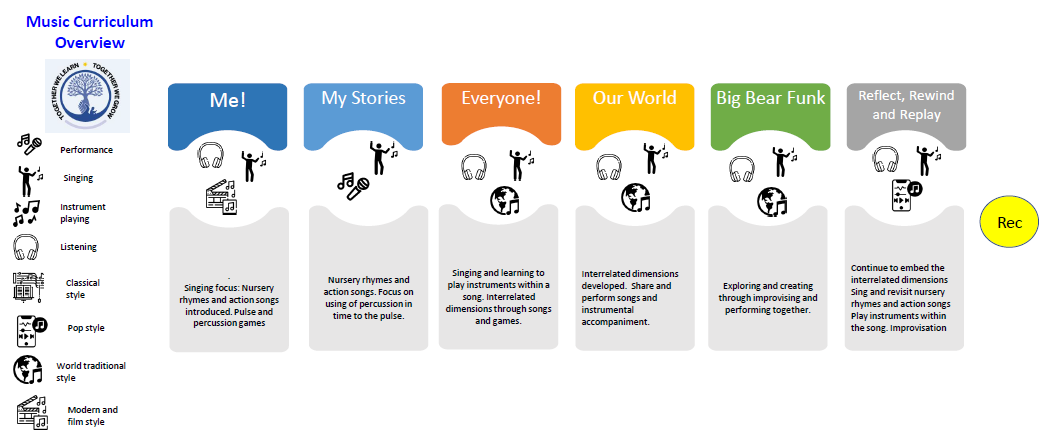 Personal development runs through everything we do in our Music curriculum; children can express themselves and their identity through music whether they are singing, composing or performing; they can develop confidence and self-esteem when trying a new instrument or creating music with others; and they can develop their own appreciation of music and learn to express their viewpoints and preferences about the music they listen to.
