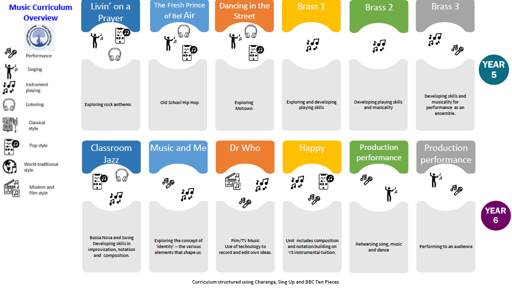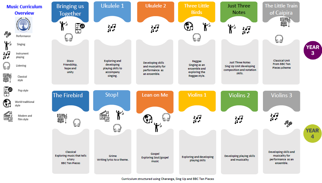 Music teaching delivers the requirements of the National Curriculum through half termly units supported by the Charanga scheme of work, ensuring consistency, progression and coherence throughout the school but also incorporating other high-quality music schemes and resources in order to make our curriculum ambitious. Our curriculum is also ambitious because we believe it is important that all children learn to play a musical instrument and this is a key feature of the design of our music curriculum.